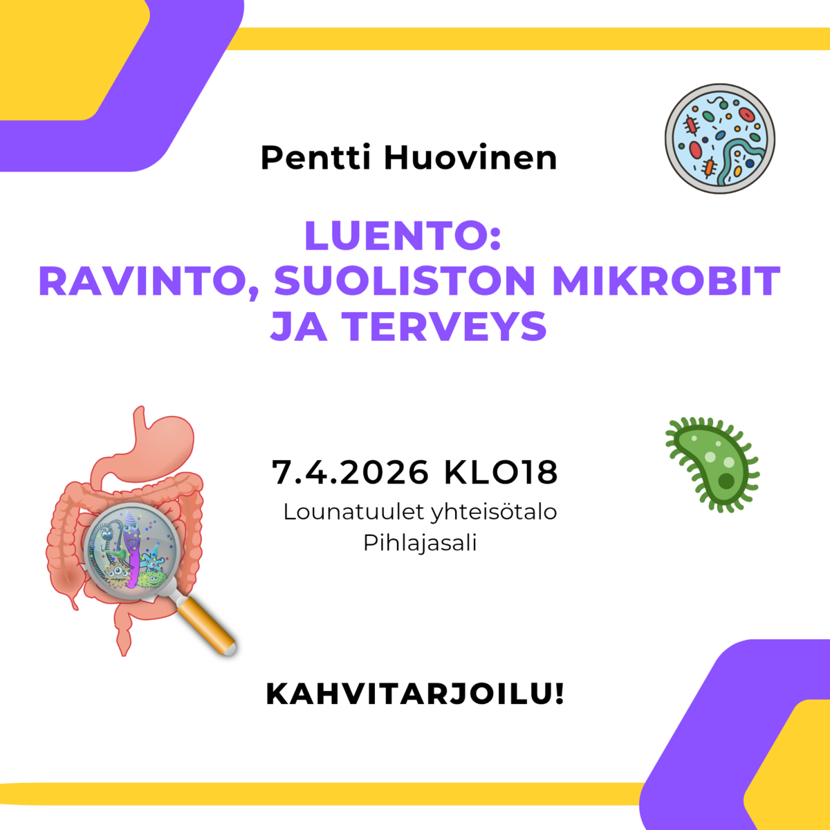 Tervetuloa kuuntelemaan professori Pentti Huovisen mielenkiintoista luentoa "Ravinto, suoliston mikrobit ja terveys"!